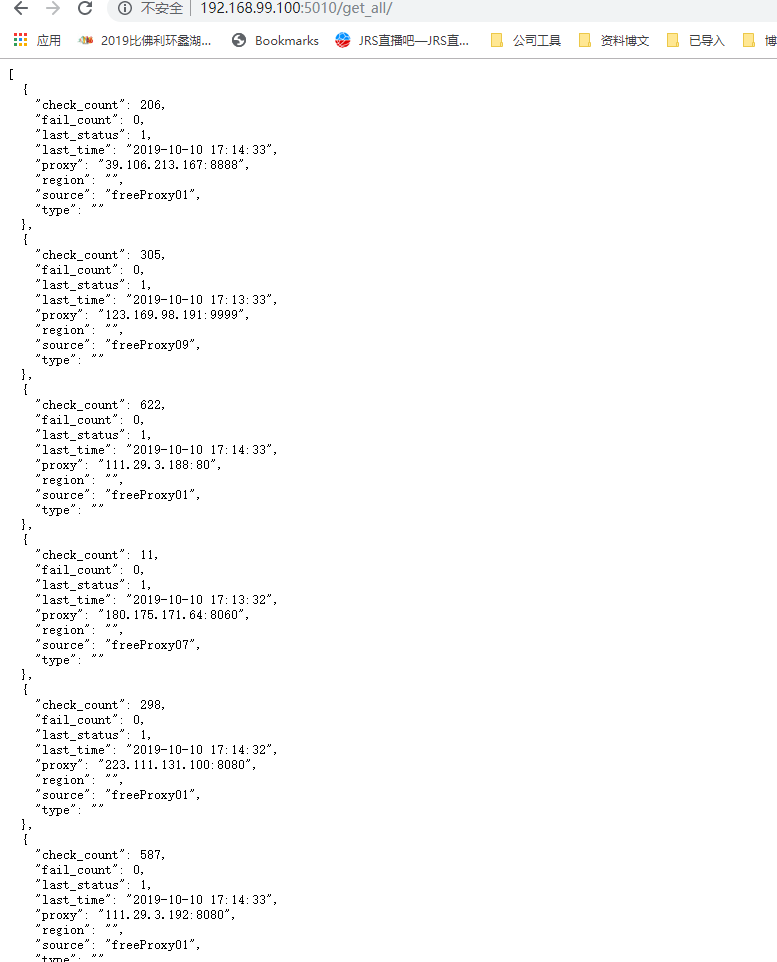 - 运行镜像后,我们等待一段时间,因为第一次启动采集数据和处理数据需要一段时间。等待之后访问 http://{your_host}:5010/get_all/,如果你得到下图所示的结果,说明 proxy_pool 项目你已经部署成功。